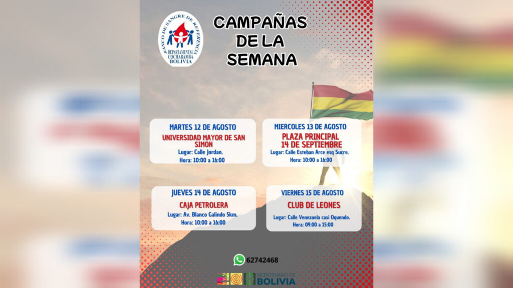 - Jueves 14 de agosto – Caja Petrolera (Av. Blanco Galindo, km 5) – 10:00 a 16:00