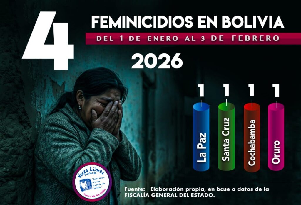 Entre el 1 de enero y el 3 de febrero de 2026, cuatro mujeres fueron víctimas de feminicidio en Bolivia, según registros oficiales. Los casos se registraron en los departamentos de Santa Cruz, Cochabamba, La Paz y Oruro, revelando que la violencia machista continúa cobrando vidas pese a las alertas y normativas vigentes.